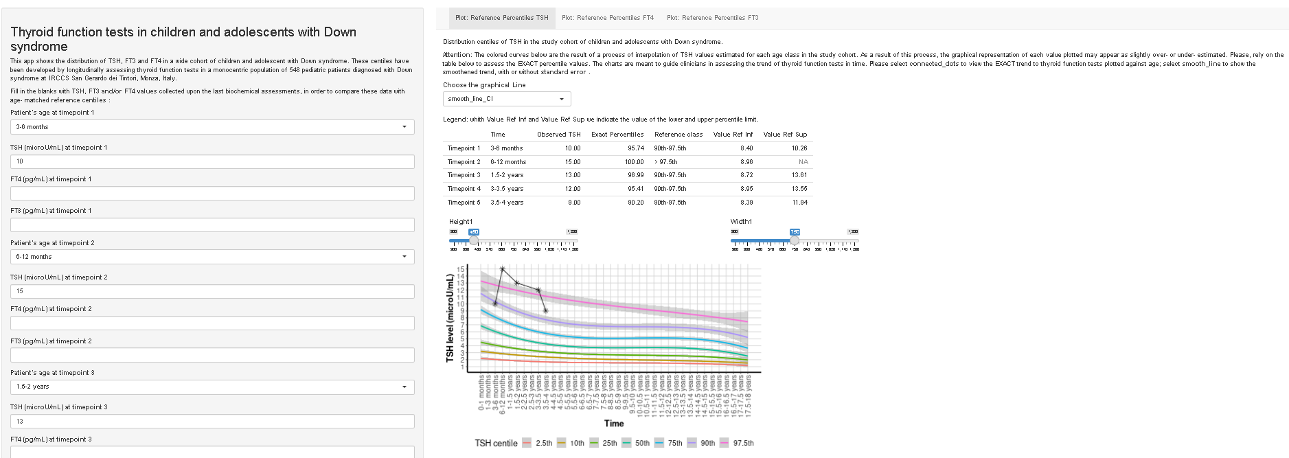 - Online Informatic Tool to Assess TSH, FT3, and FT4 Centile in children and adolescents with Down syndrome: In order to support clinicians in comparing TSH, FT3, and FT4 with the reference percentiles of thyroid function tests described in the present work, I developed a user-friendly web tool, available online at: Percentile-Thyroid-ChildrenTrisomy21. By filling in the blanks, the tool provides the calculated centile for each determination with reference to our data and graphically plots up to 5 sequentially assessed values.
